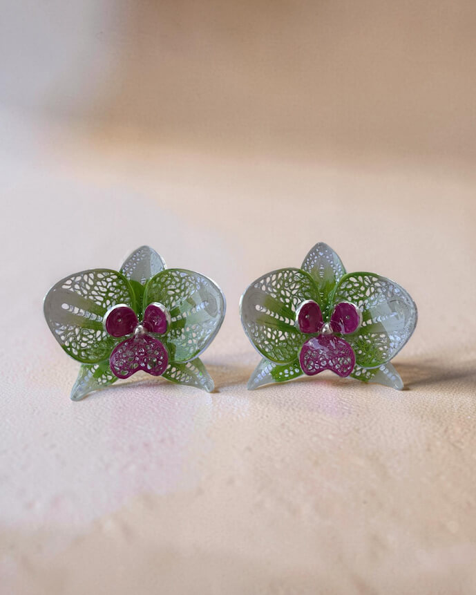 Los Aretes Cattleya están inspirados en una de las orquídeas más emblemáticas del Ecuador. Elaborados a mano en filigrana de plata con esmaltado translúcido, cada pieza captura la forma, el color y la delicadeza de una flor viva.