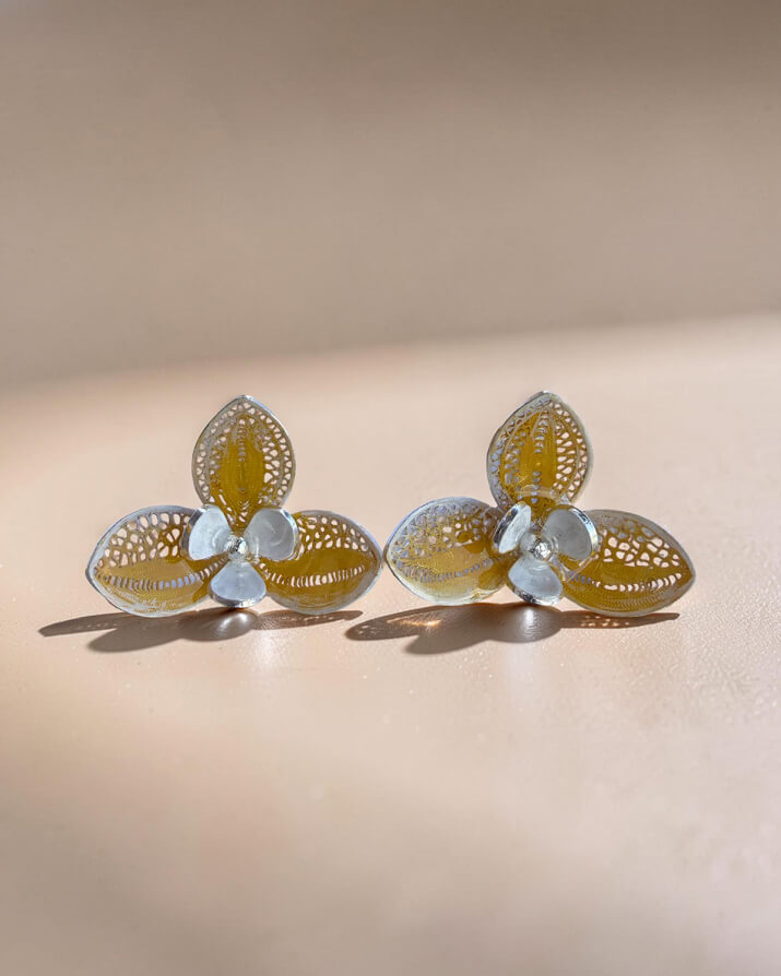 Los Aretes Pétalos están inspirados en la delicadeza de las orquídeas ecuatorianas. Hechos a mano en filigrana de plata con esmaltado translúcido, permiten que la luz atraviese cada detalle, creando un brillo suave y único. Ligeros, femeninos y profundamente artesanales, una pieza para hacerte brillar.