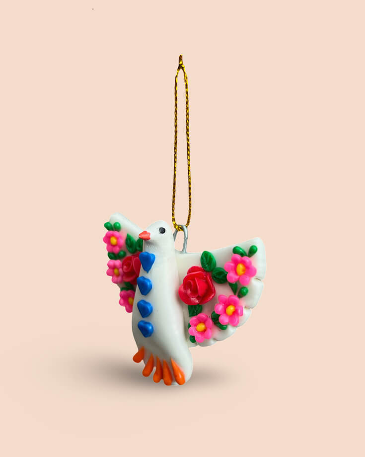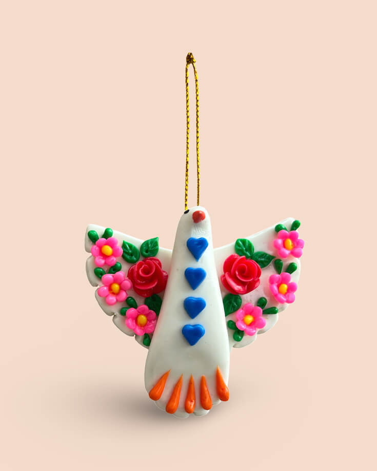 Cada una se modela a mano. Las flores, los corazones, los detalles diminutos… nada está impreso ni repetido. Cada pieza es irrepetible, como las manos que la crean. Pequeña y ligera, puedes colgarla en tu árbol de Navidad, en una ventana o sobre tu escritorio. Pero más que un adorno, es un símbolo: de paz, de cariño y de las historias que aún se cuentan con las manos.