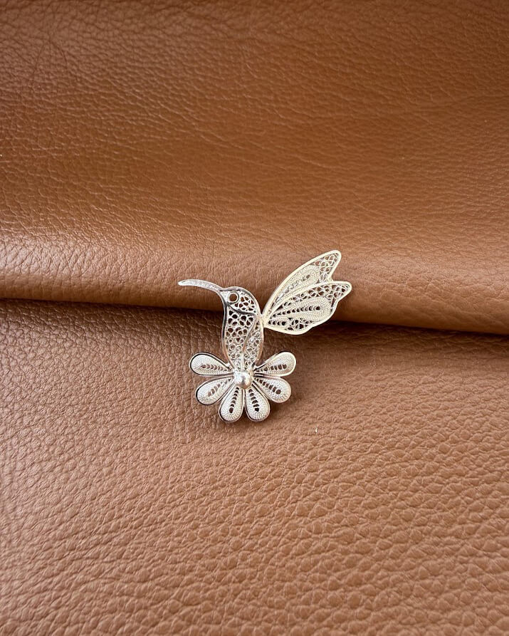 Elaborado en filigrana de plata 975, una técnica que entrelaza finos hilos metálicos formando estructuras delicadas, casi como encaje.